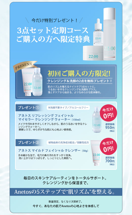 【定期便】22:00 アネトス 3点セット(トナー+セラム+クリーム)+クレンジング&洗顔付き【初回限定特典】