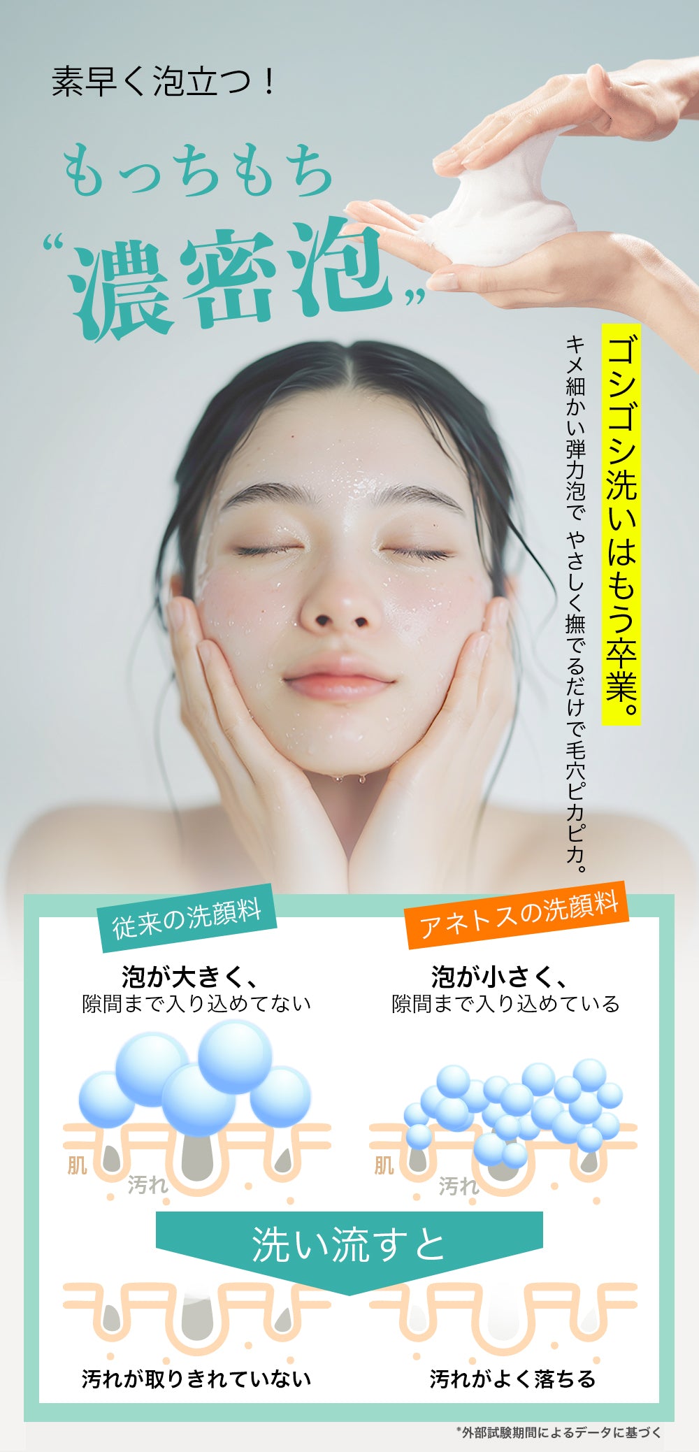 ※清潔な手のひらに適量をとり、水又はぬるま湯でよく泡立て、泡でやさしくマッサージするように洗い、その後すすぎ残しのないよう十分に洗い流してください。 |